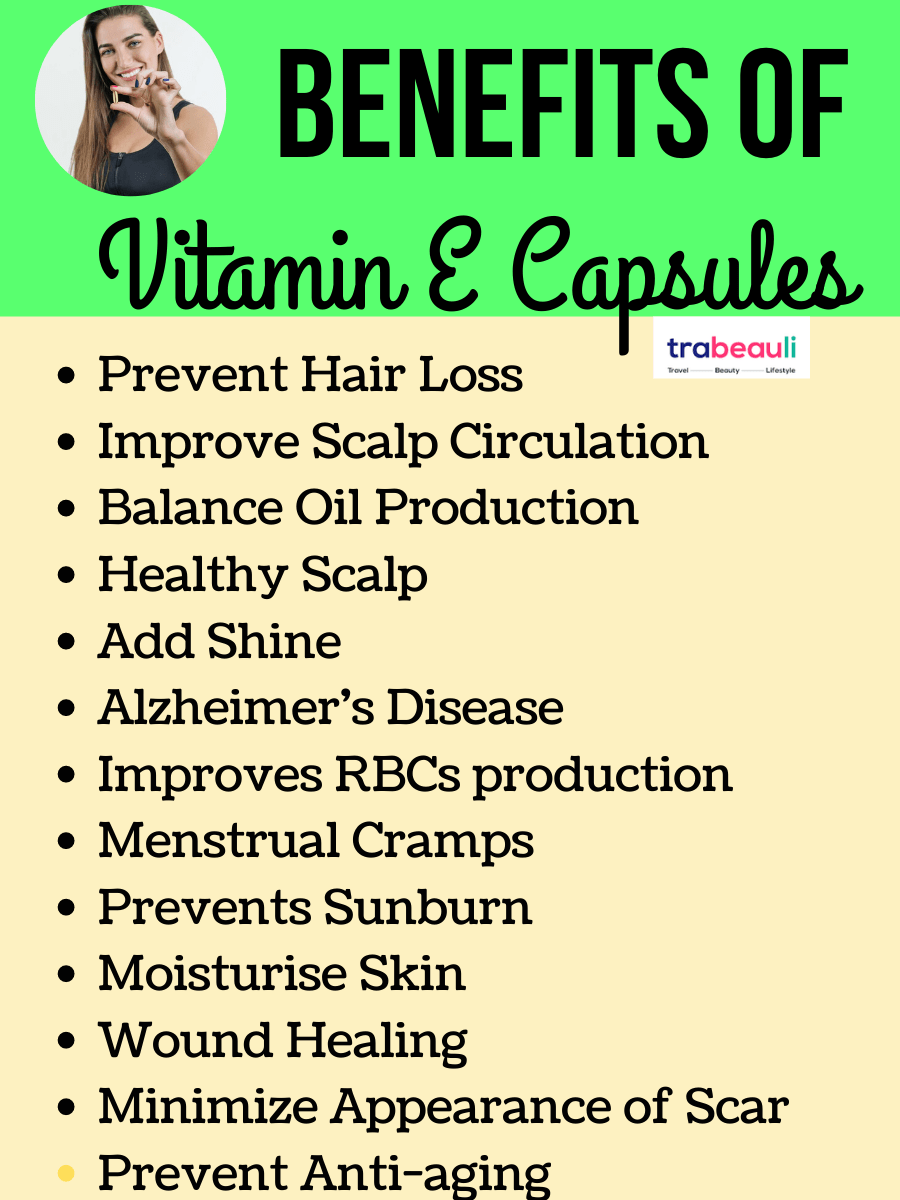 Vitamin E helps in increasing the blood flow, which improves the scalp circulation and promotes new hair growth. It also helps in increasing the hair follicles.