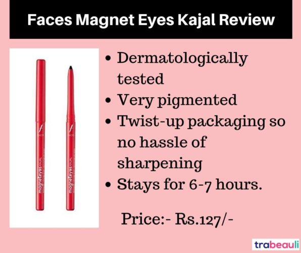 The Canadian brand “Faces”, has come up with an amazing kajal. Its pigmentation is jet black, just one stroke of it and you are good to go. You can create a great smokey eye with it as it does not dry out quickly. It stays for 6-7 hours.