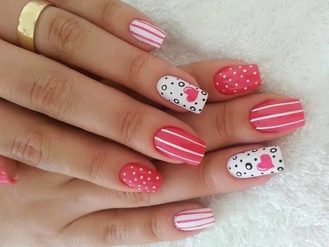 How about different nail art on every nail. Sounds fun? Right, well that’s why this nail art is called as Colourful valentines