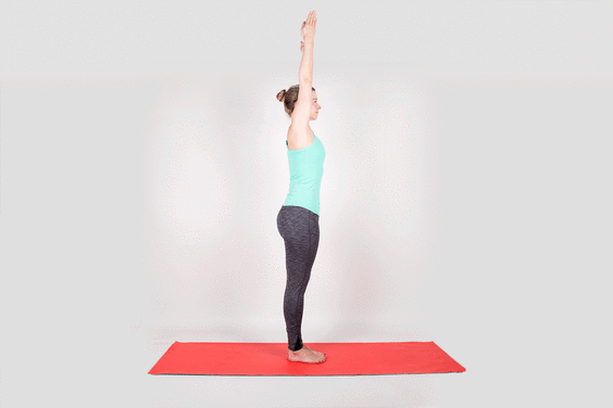 - Your hands above your head straight with palms in the namaskar position.
